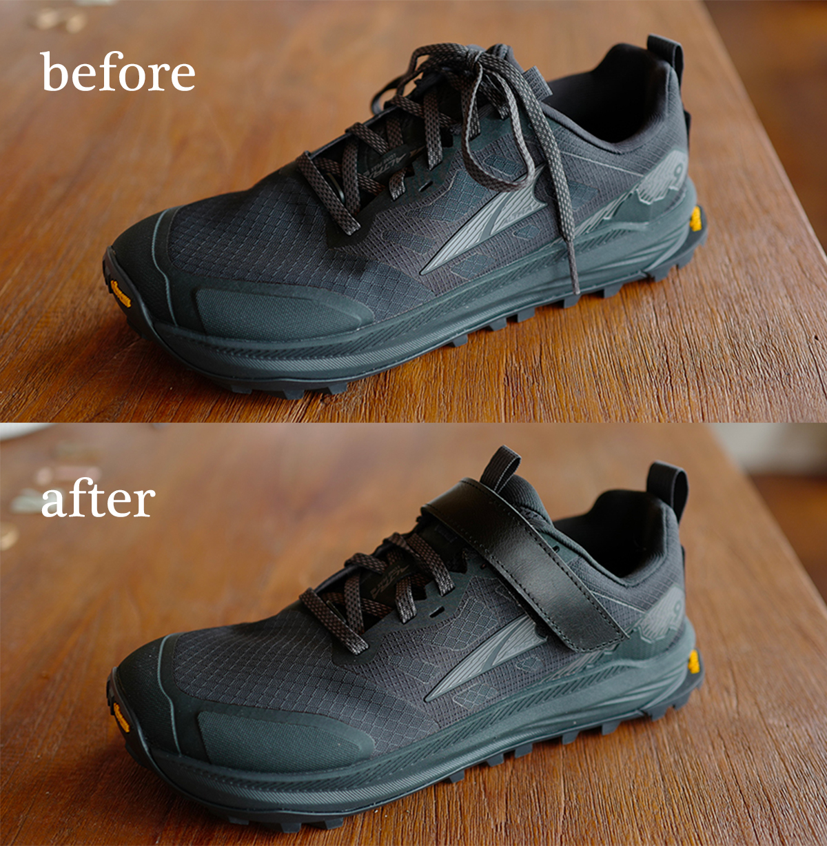 靴紐を毎回結ぶのが困難な方のために、マジックテープで締められるベルクロをお付けします。